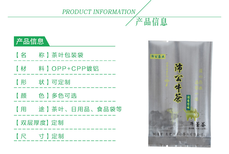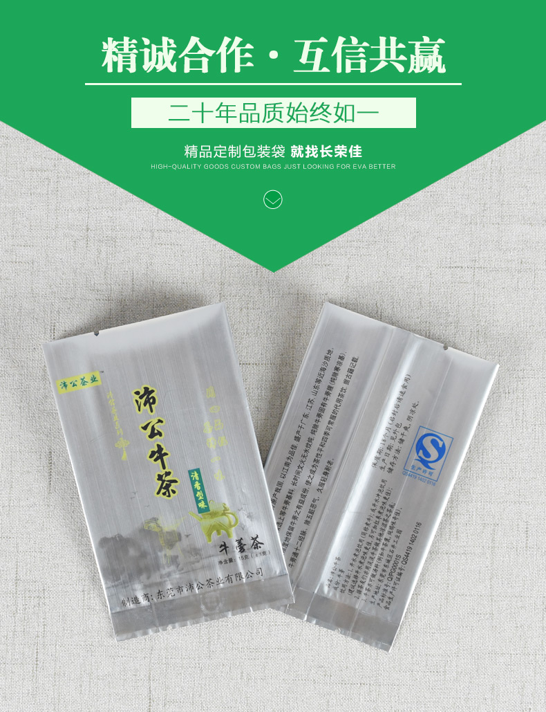 茶葉袋的材質采用的是PET復合純鋁復合PE,因為純鋁是最適合做真空袋的,然而鋁箔的阻隔性和遮光性也是最好的,加上食品級別的材質,可謂是您當之無愧的選擇。